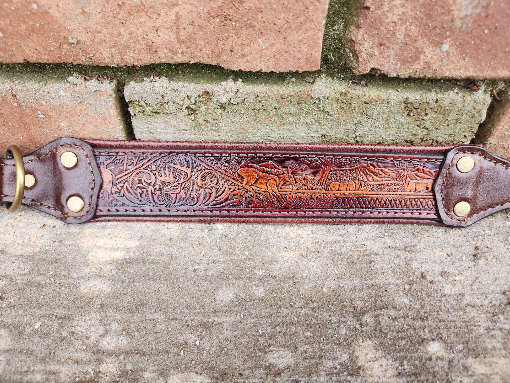 Chocolate Brown Leather Collar – Embossed Deer/Bucks Design with Padded Brown Back
