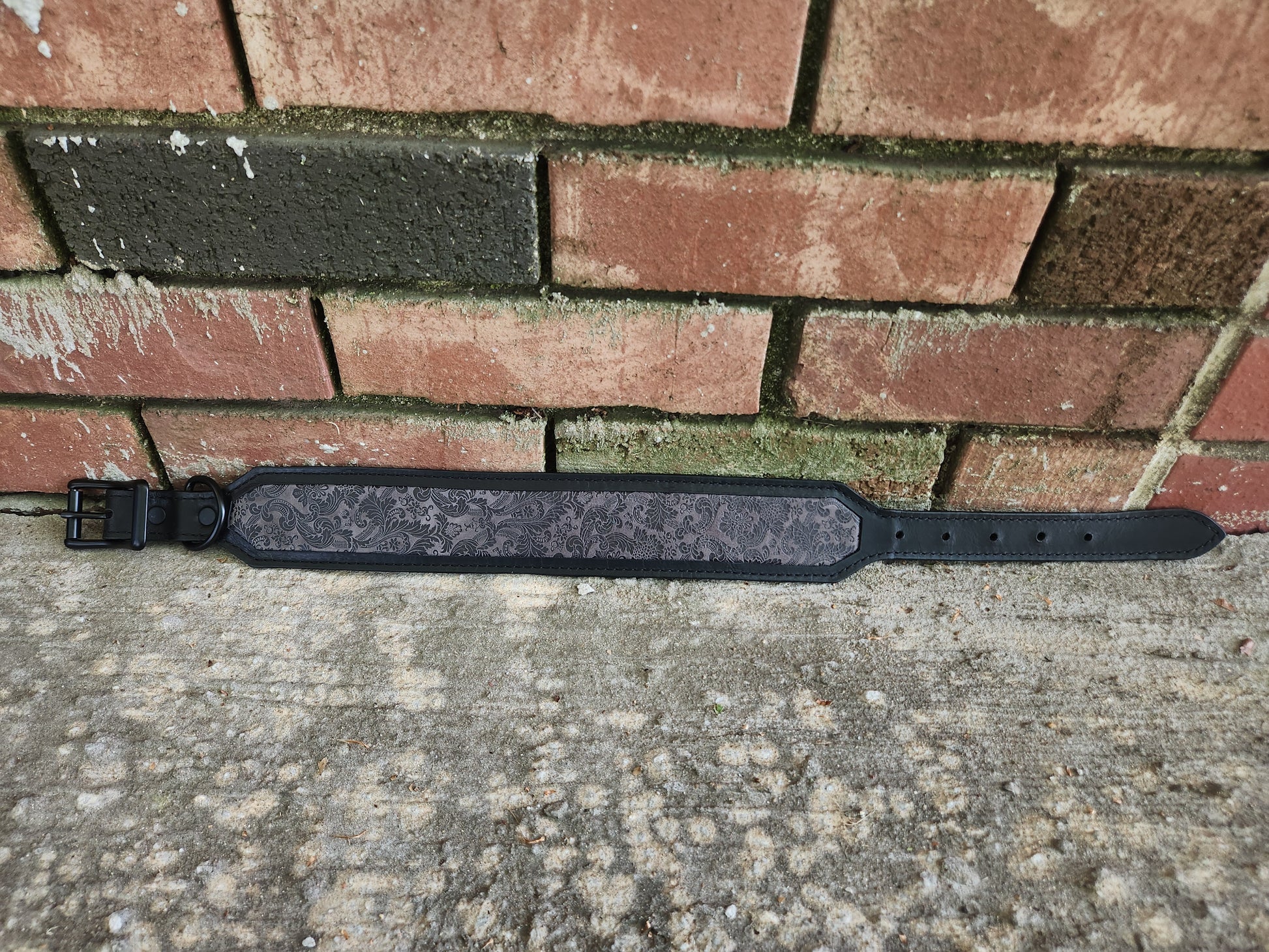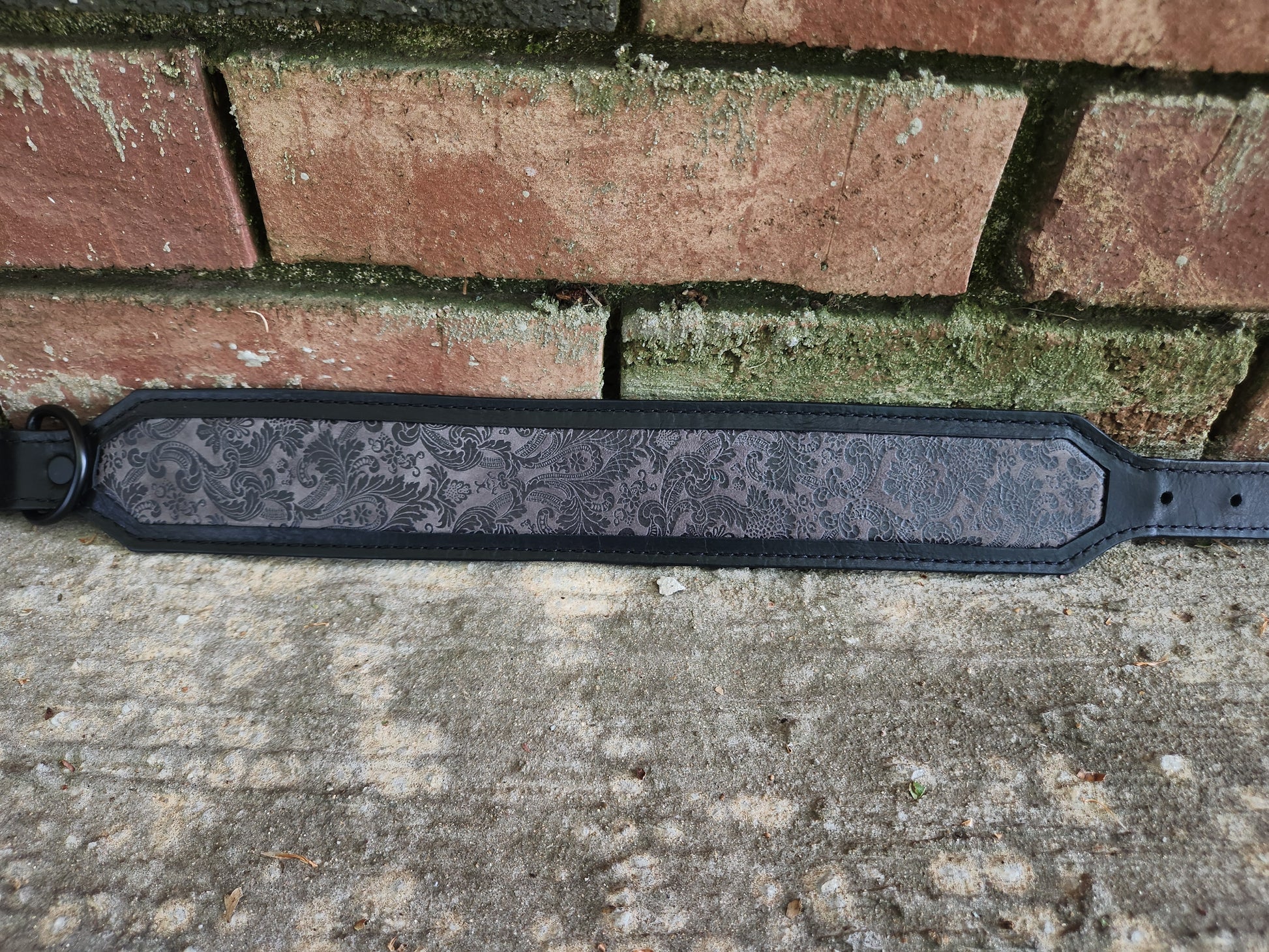 Turn heads with this gorgeous black leather collar that’s anything but ordinary! A dreamy grey floral leather inlay adds just the right touch of elegance, while the sleek black hardware keeps things looking modern and effortlessly cool. It’s the perfect mix of classy and sassy for pups who know how to work their style.