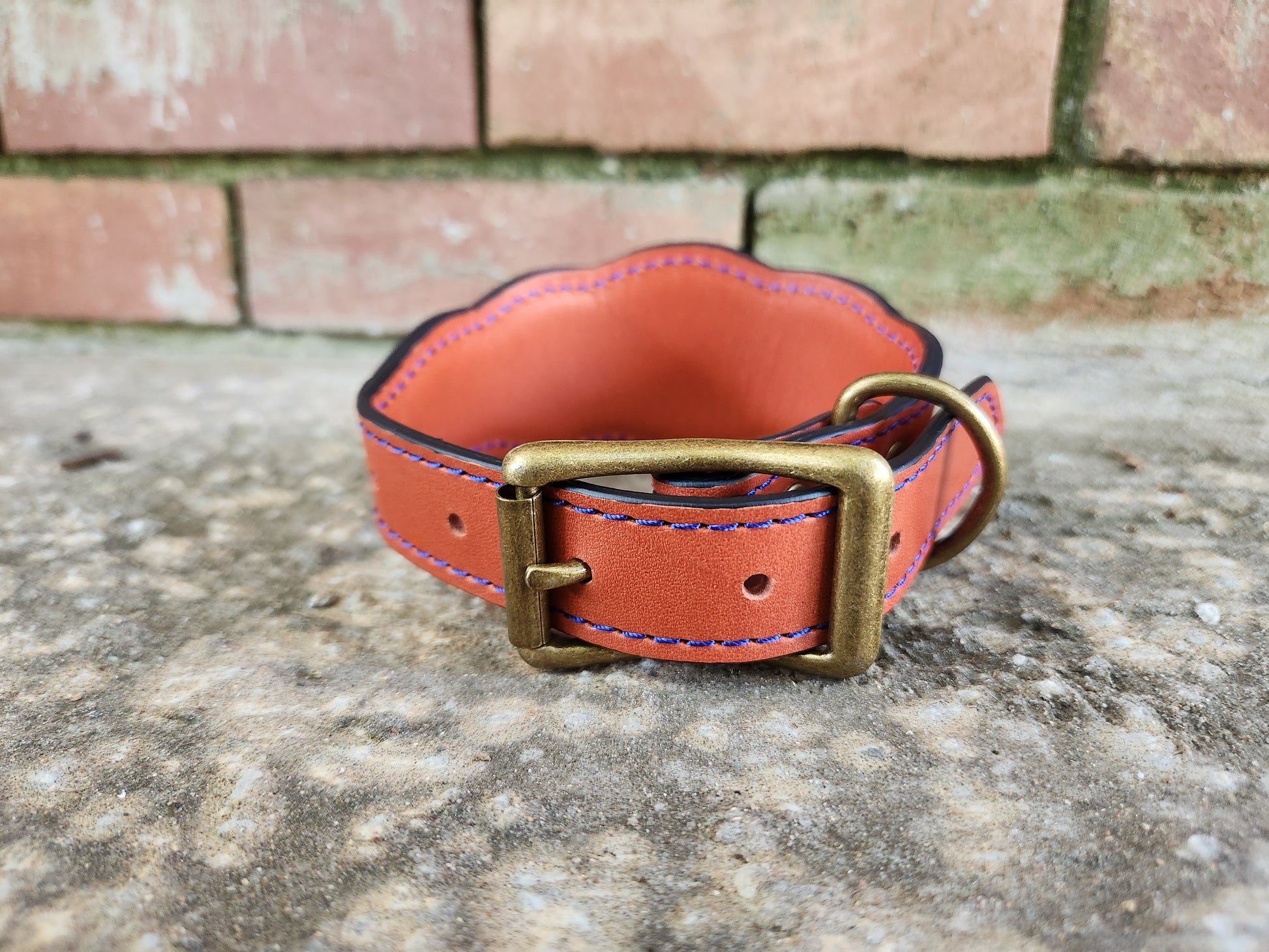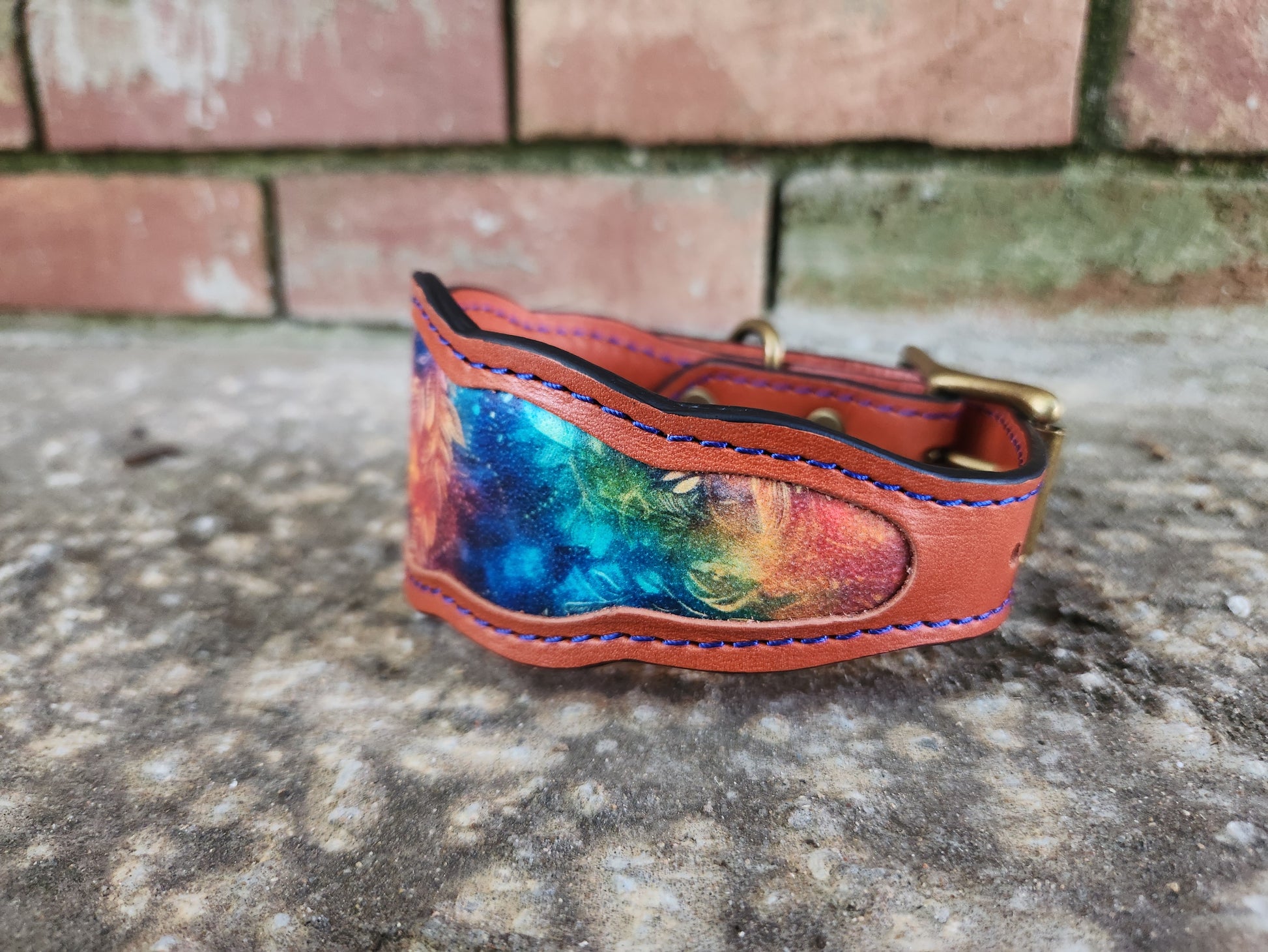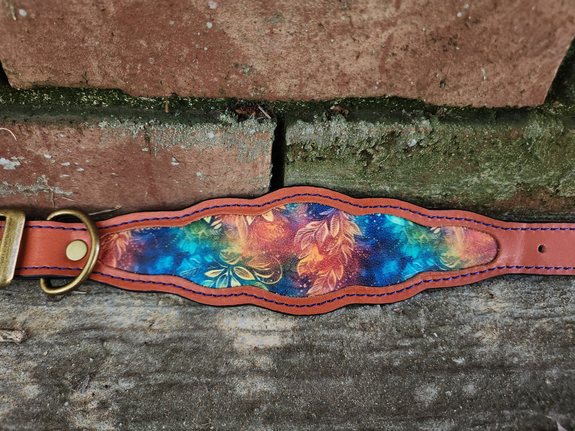 This vibrant leather collar showcases a rich orange base paired with a boho-style printed leather inlay in shades of orange, blue, green, and yellow with a charming floral pattern. Dark blue stitching adds a bold contrast, while antique brass hardware completes the look. Measuring 2" at its widest point and tapering to 1" for comfort, it fits neck sizes 10.5–14.5" and brings both personality and durability to your pup’s wardrobe.