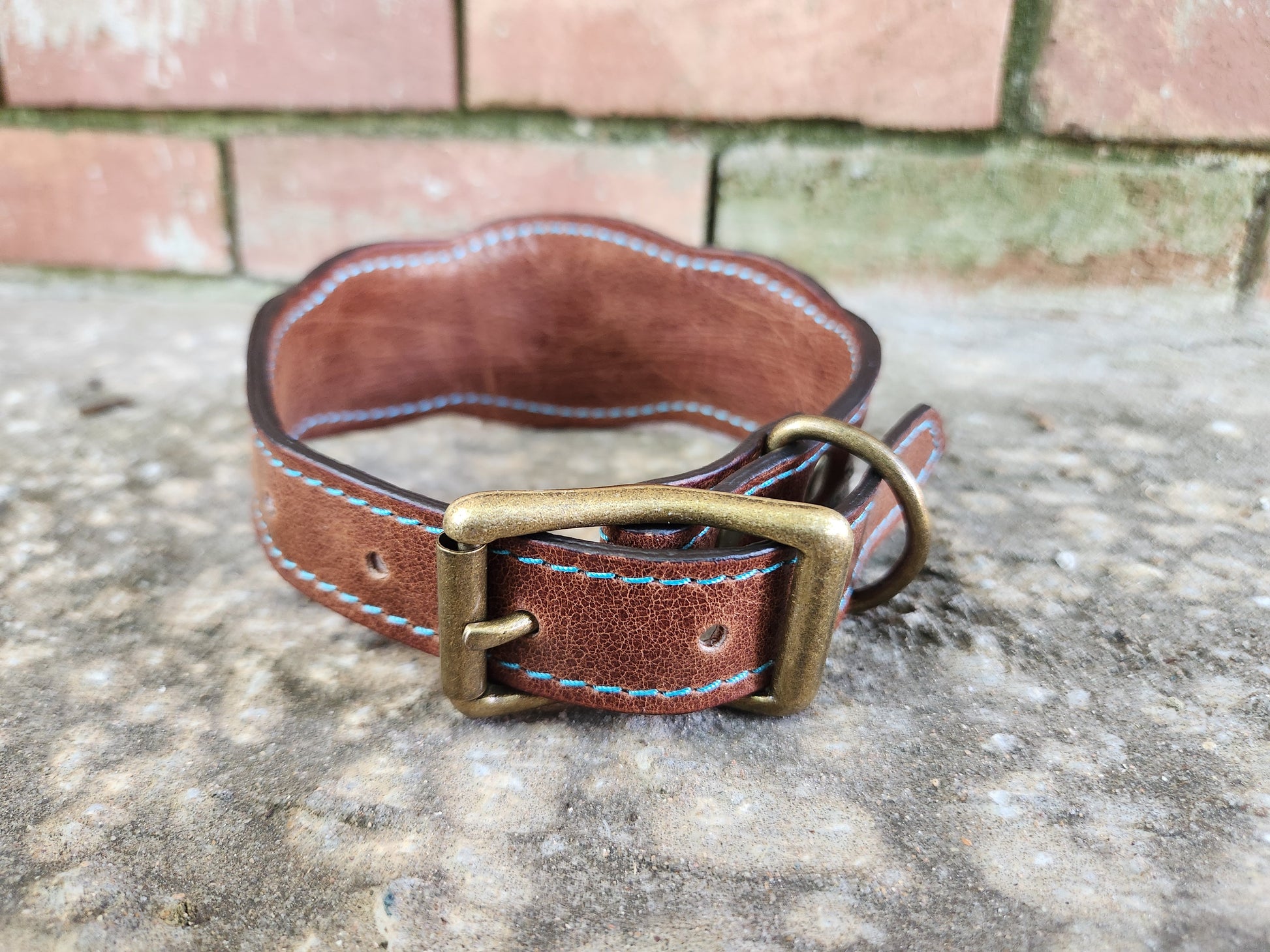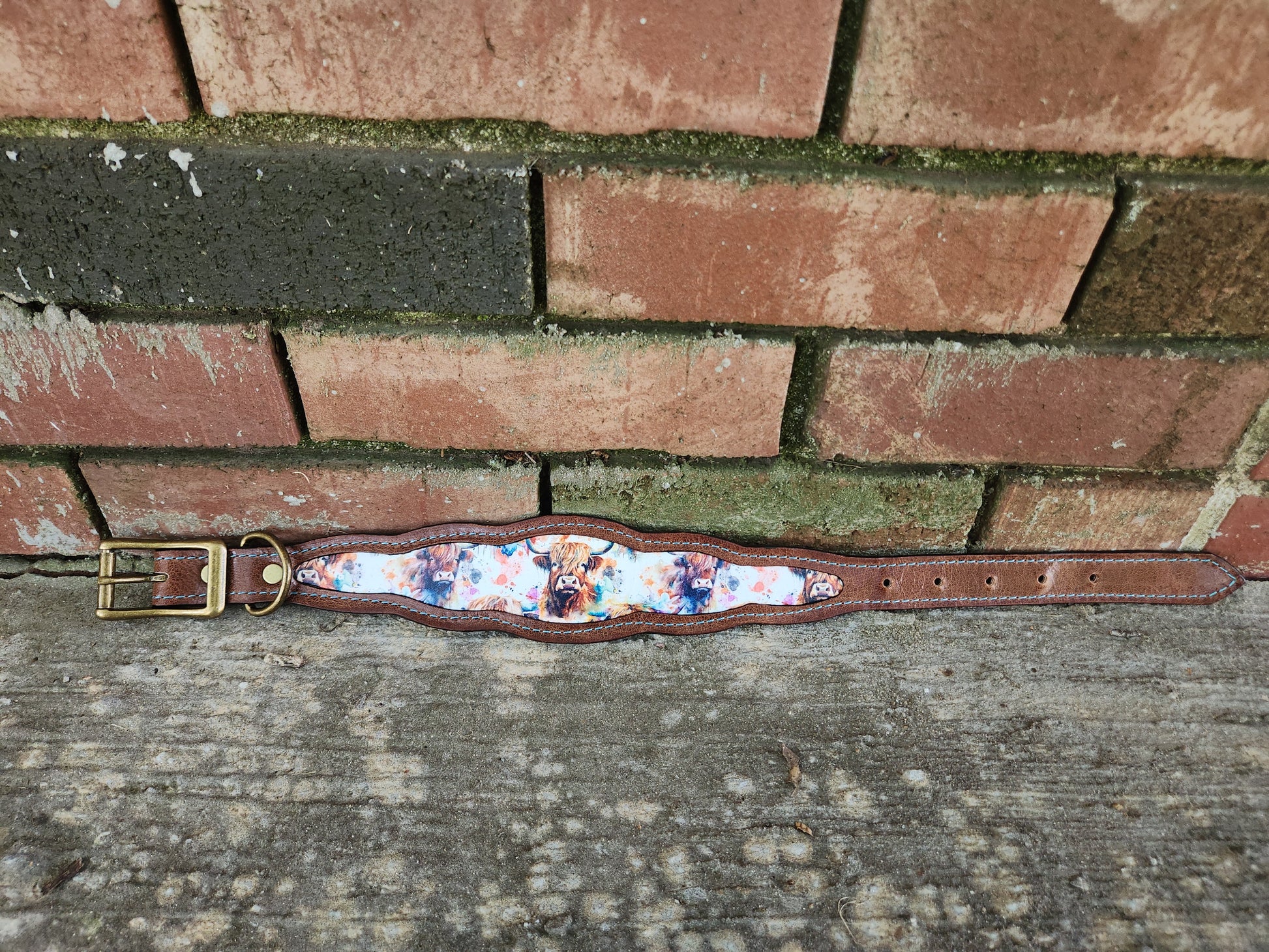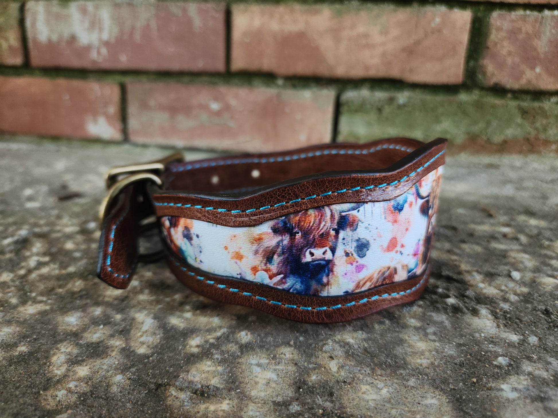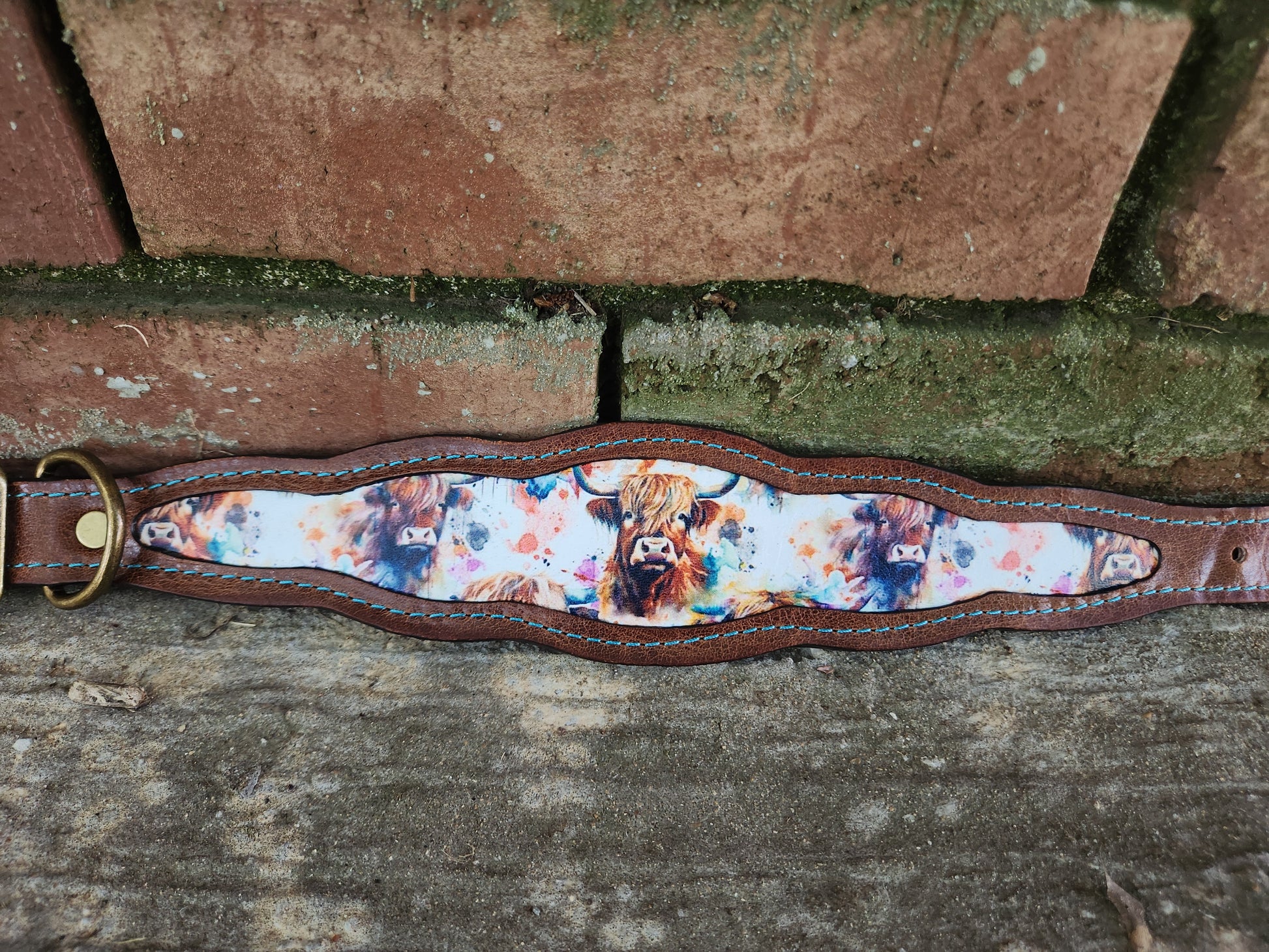 Saddle up for style with this western-inspired leather collar! Crafted from rich medium brown leather, it features a charming printed leather inlay showcasing adorable Highland cows—perfect for adding a touch of country charm to your pup’s look. Light blue stitching adds a pop of color, while antique brass hardware enhances the rustic, cowboy-ready vibe.
