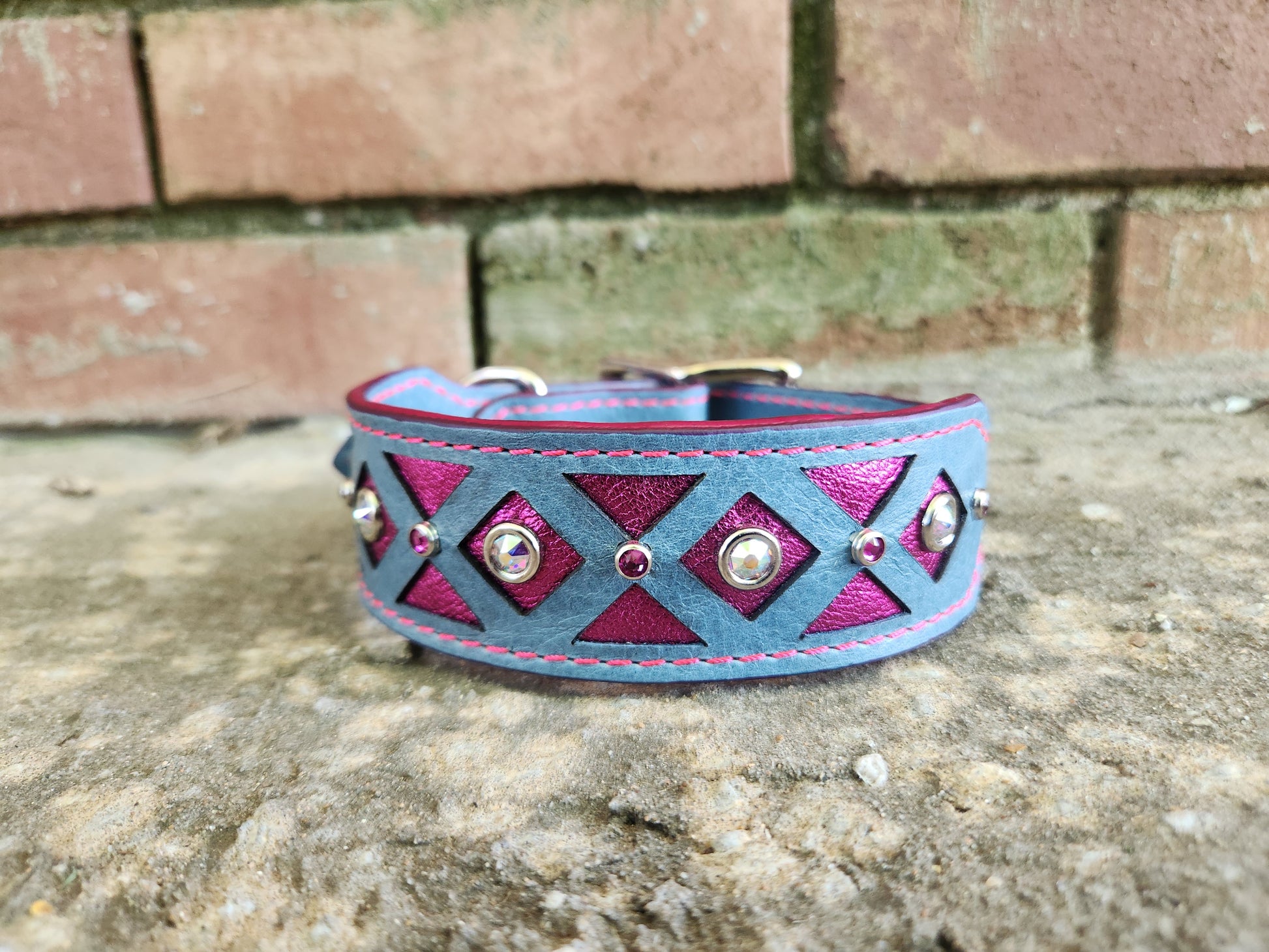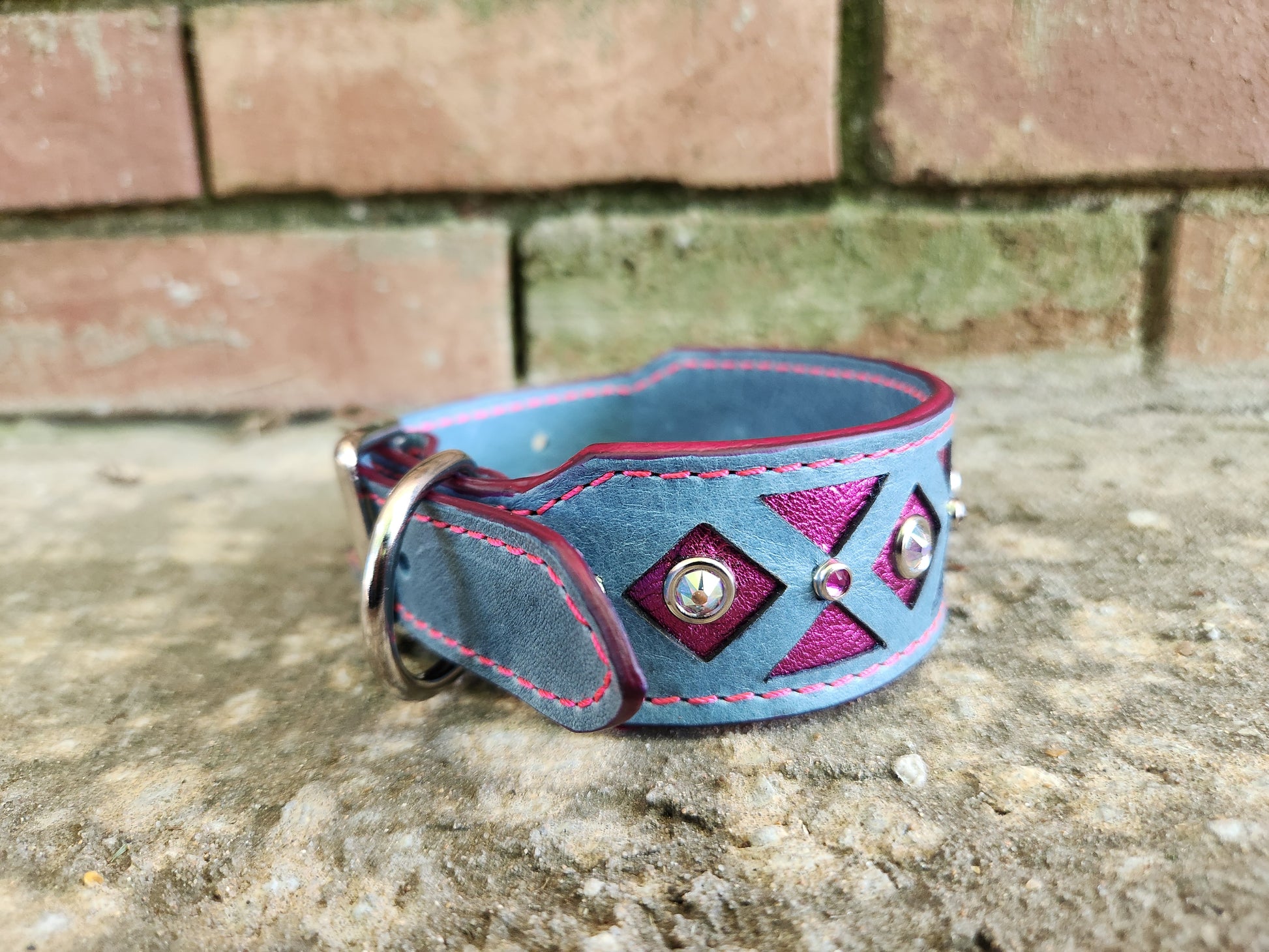 Light blue leather with a bold metallic hot pink underlay gives it serious style points, while pink and white crystals add the perfect amount of glam. Bright pink stitching ties it all together in the best way.
