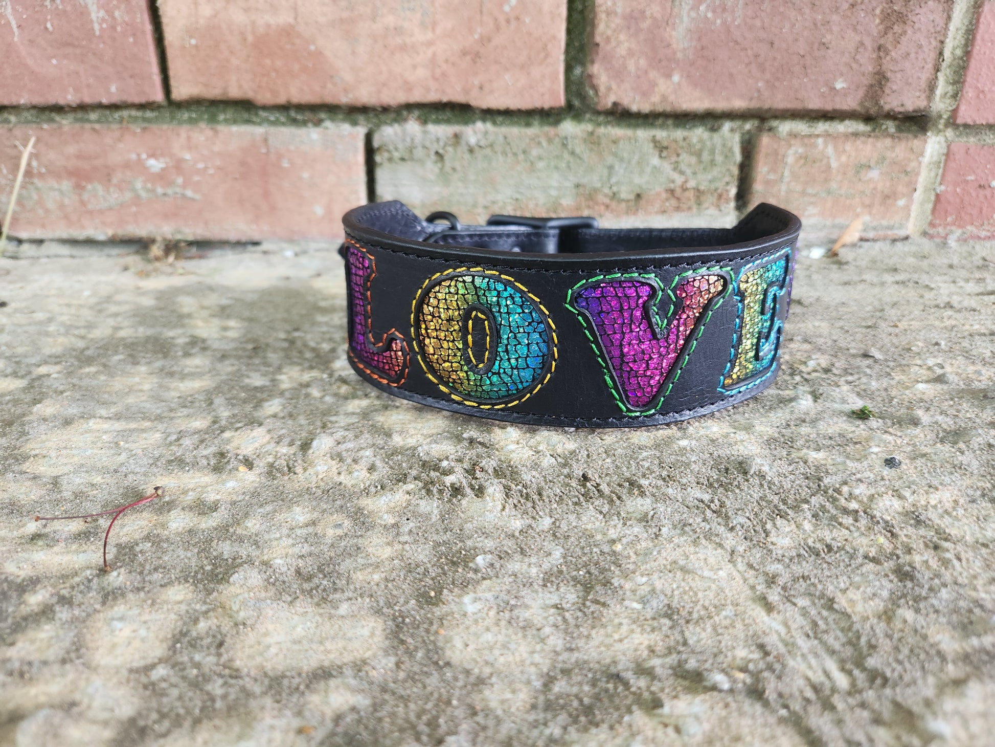 Celebrate love and individuality with this bold, handcrafted black leather dog collar. Featuring heart-shapes and the word LOVE cutout, each opening is inlaid with vibrant crackle rainbow suede—creating a colorful mosaic effect that catches the eye. Rainbow stitching adds a playful, expressive accent while reinforcing the collar's durability and is finished with sleek black hardware for a modern, unified look.