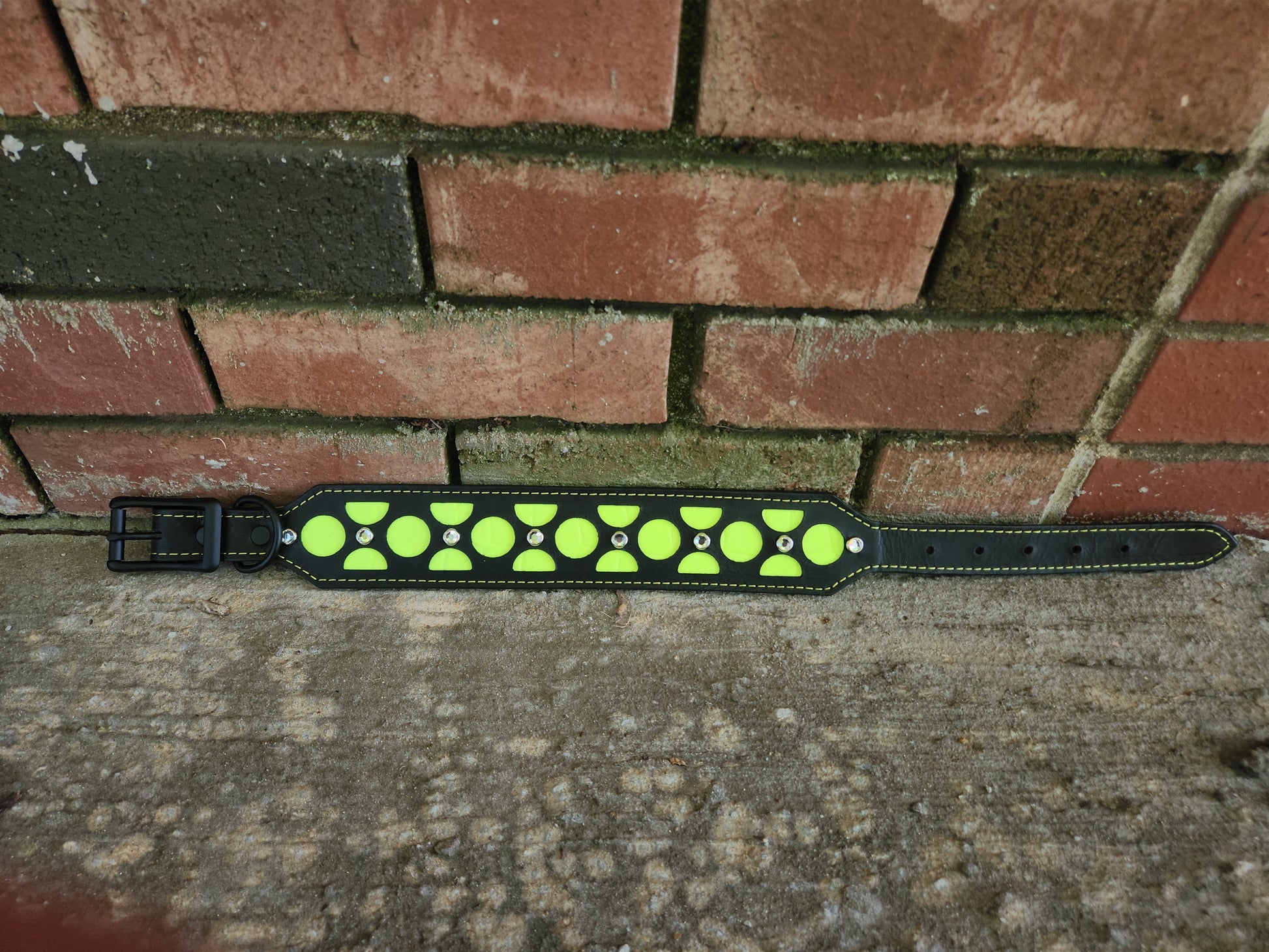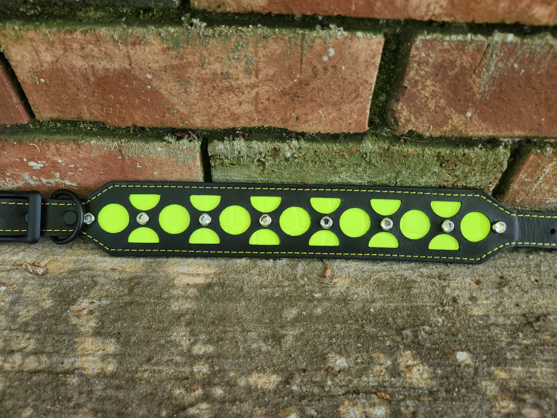 Bright, bold, and unapologetically fun — Neon Pop is a statement collar that channels retro arcade vibes with a modern edge. Vibrant neon green half-circle cutouts burst through matte black leather, creating a playful polka-dot illusion. Clean yellow stitching and sparkling rivets add extra punch, while the sleek black hardware keeps the look sharp and stylish.
