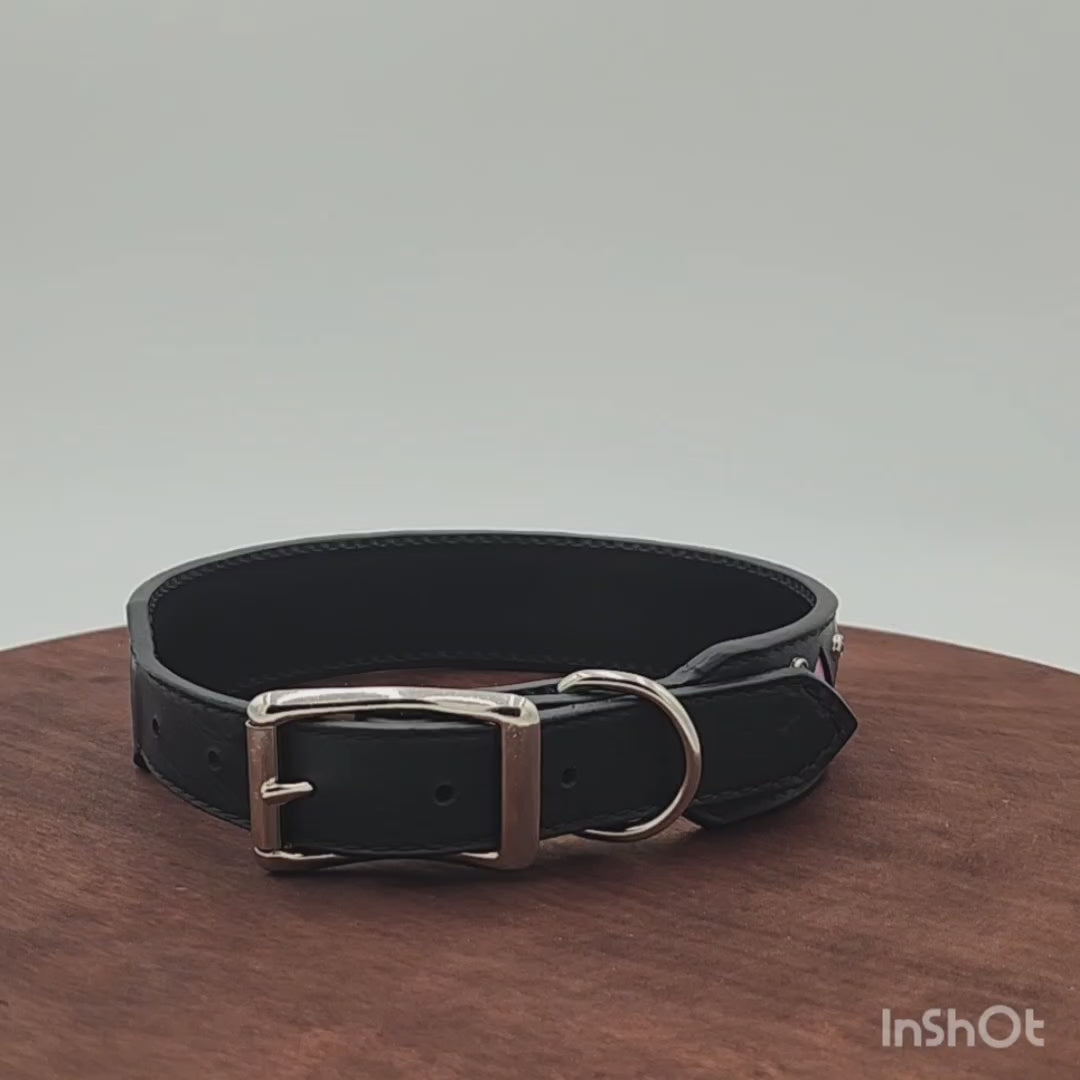 This striking black leather collar features diamond-shaped cutouts showcasing a beautiful pastel rainbow leather underneath. The design is accented with matching pastel rainbow stones that border the collar, adding just the right touch of sparkle.