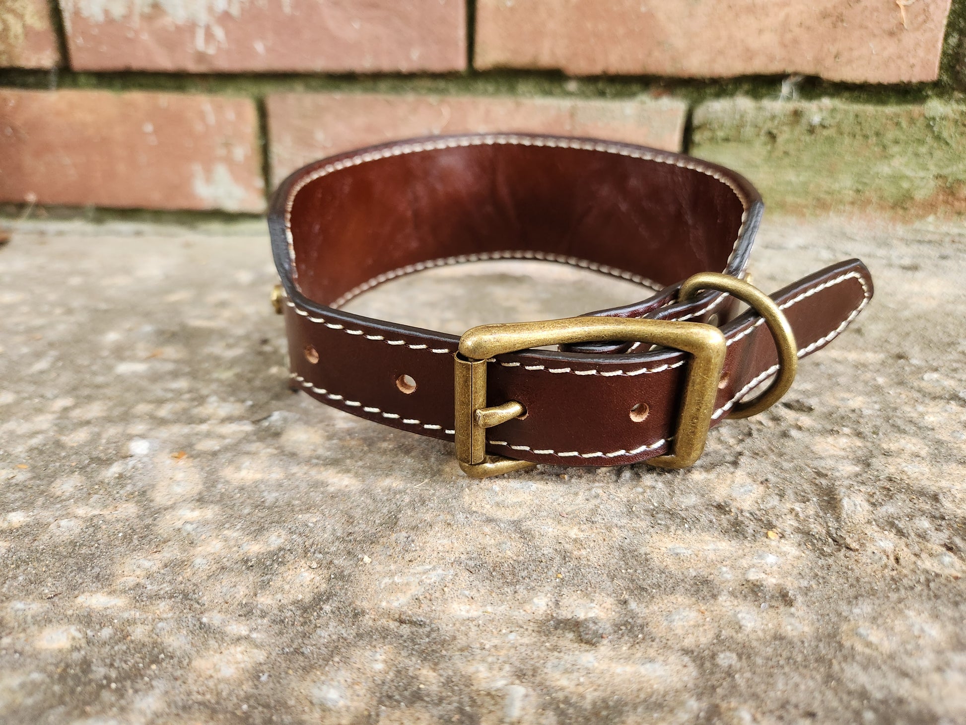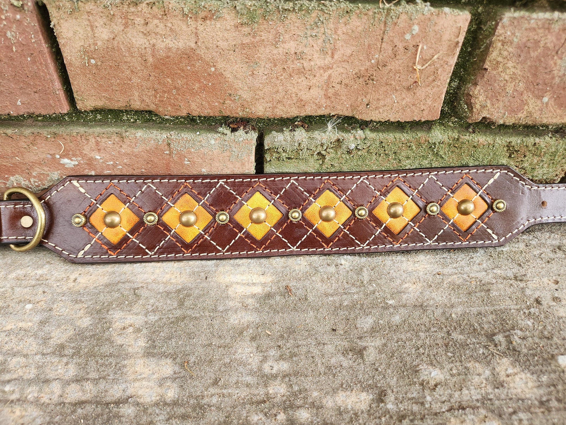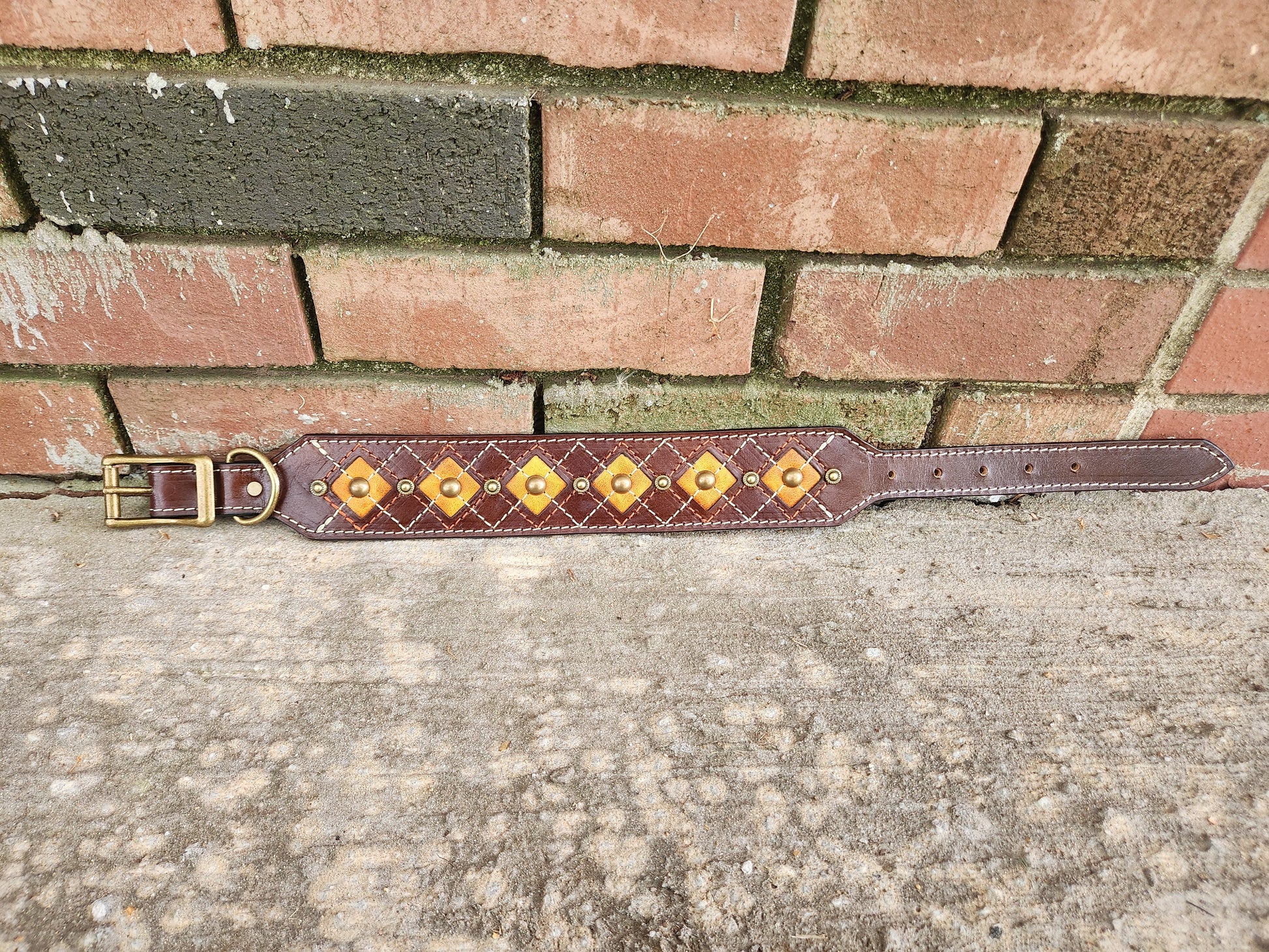 Warm and cozy like autumn itself, this collar is crafted from rich chocolate brown leather with vibrant orange inlays. An argyle pattern in orange and cream stitching brings pumpkin-spice charm, while antique brass hardware and decorative studs complete the rustic fall look. At 2 inches wide tapering to 1 inch, it’s built to fit necks from 14.5–18.5 inches—perfect for pets who love strolling through crunchy leaves in style.