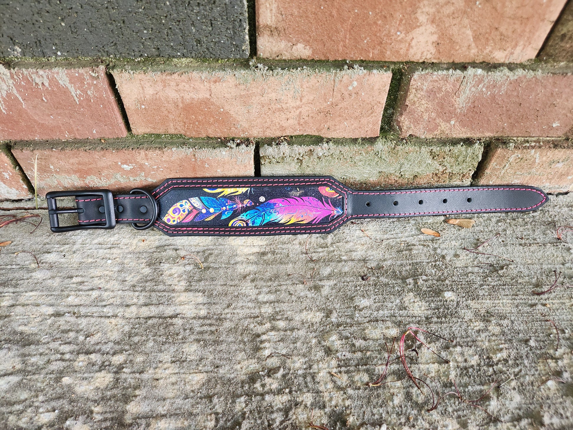 This striking black leather collar features a vibrant, multi-color feather design printed onto a sleek leather inlay. The bold, bright pink stitching adds a pop of color, while the black hardware ensures durability and style. With a width of 2 inches that tapers down to 1 inch, it's the perfect combination of edgy and eye-catching, guaranteed to make a statement.