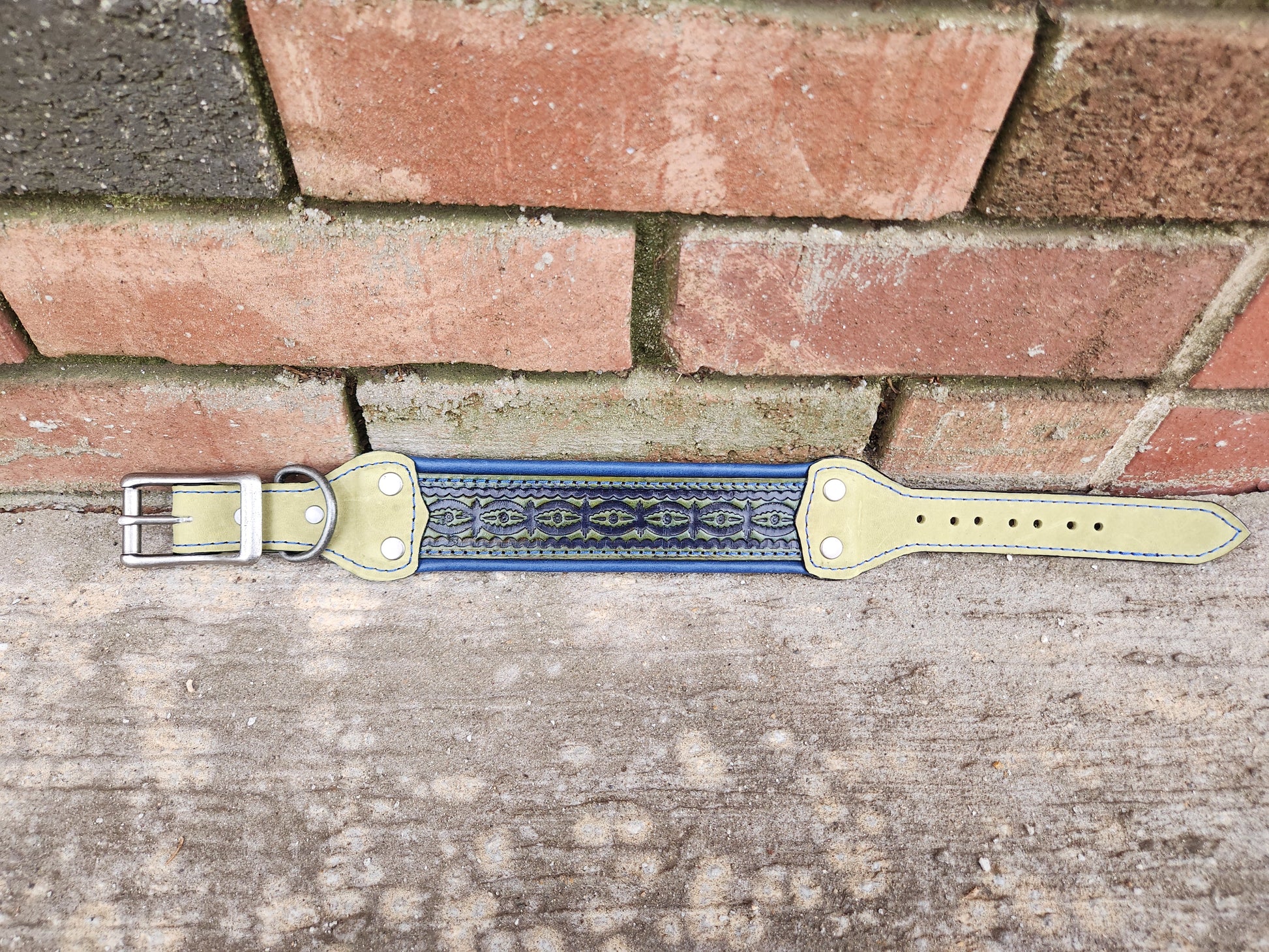 Distinctive and stylish, this handcrafted collar features a striking combination of green and navy leather, enhanced by an embossed geometric pattern that adds texture and depth. The padded navy leather backing provides comfort for everyday wear, while antique silver hardware lends a refined, vintage-inspired finish.