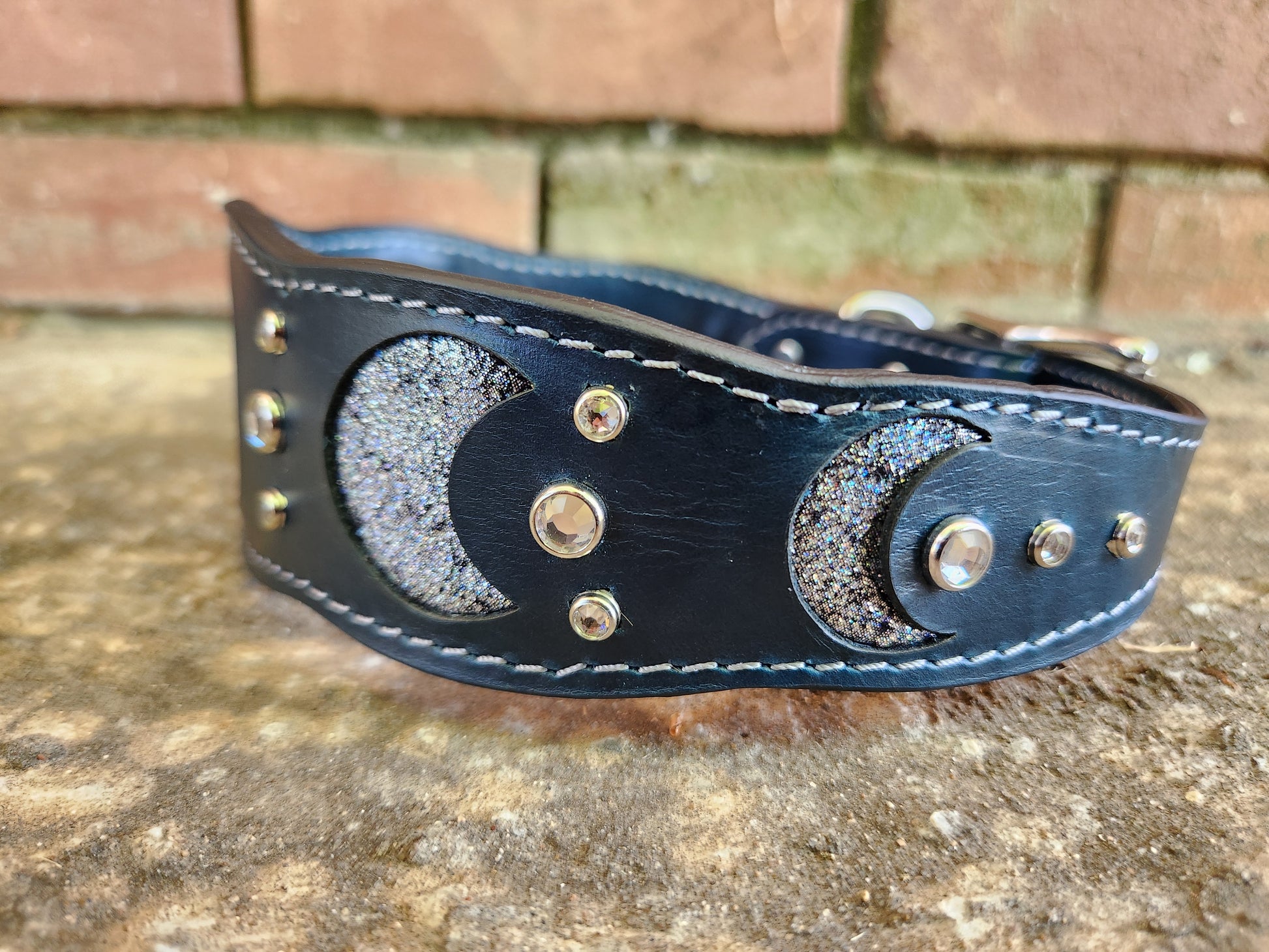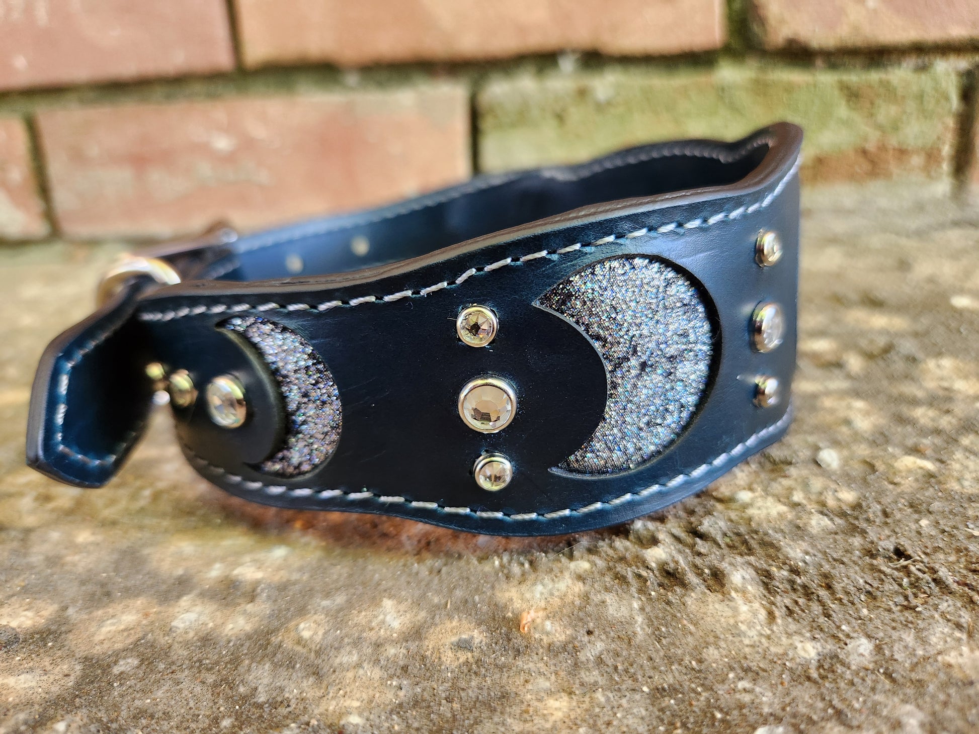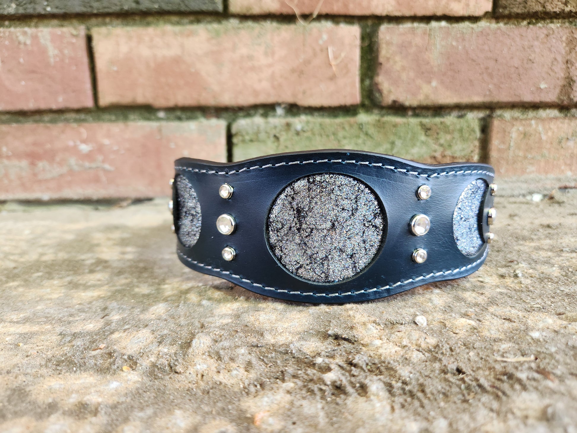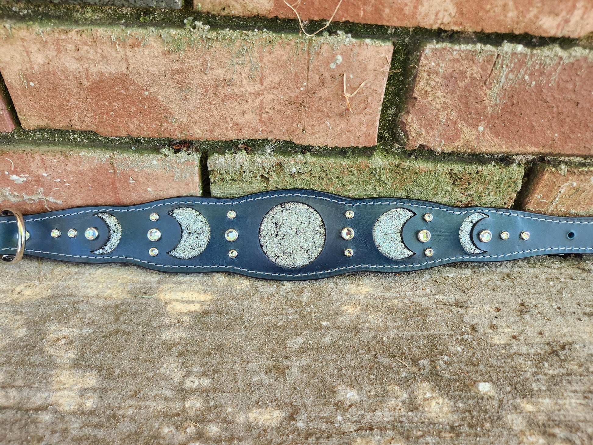 ✨ Make a statement with this enchanting collar! Crafted from rich dark teal leather, it features moon phase cutouts inlaid with shimmering metallic silver suede. White crystals add just the right touch of sparkle, while silver stitching and sleek silver-toned hardware tie the celestial look together. At 2 inches wide tapering down to 1 inch for comfort, this collar is designed to fit necks sized 16–20 inches. A perfect mix of bold, magical, and elegant!