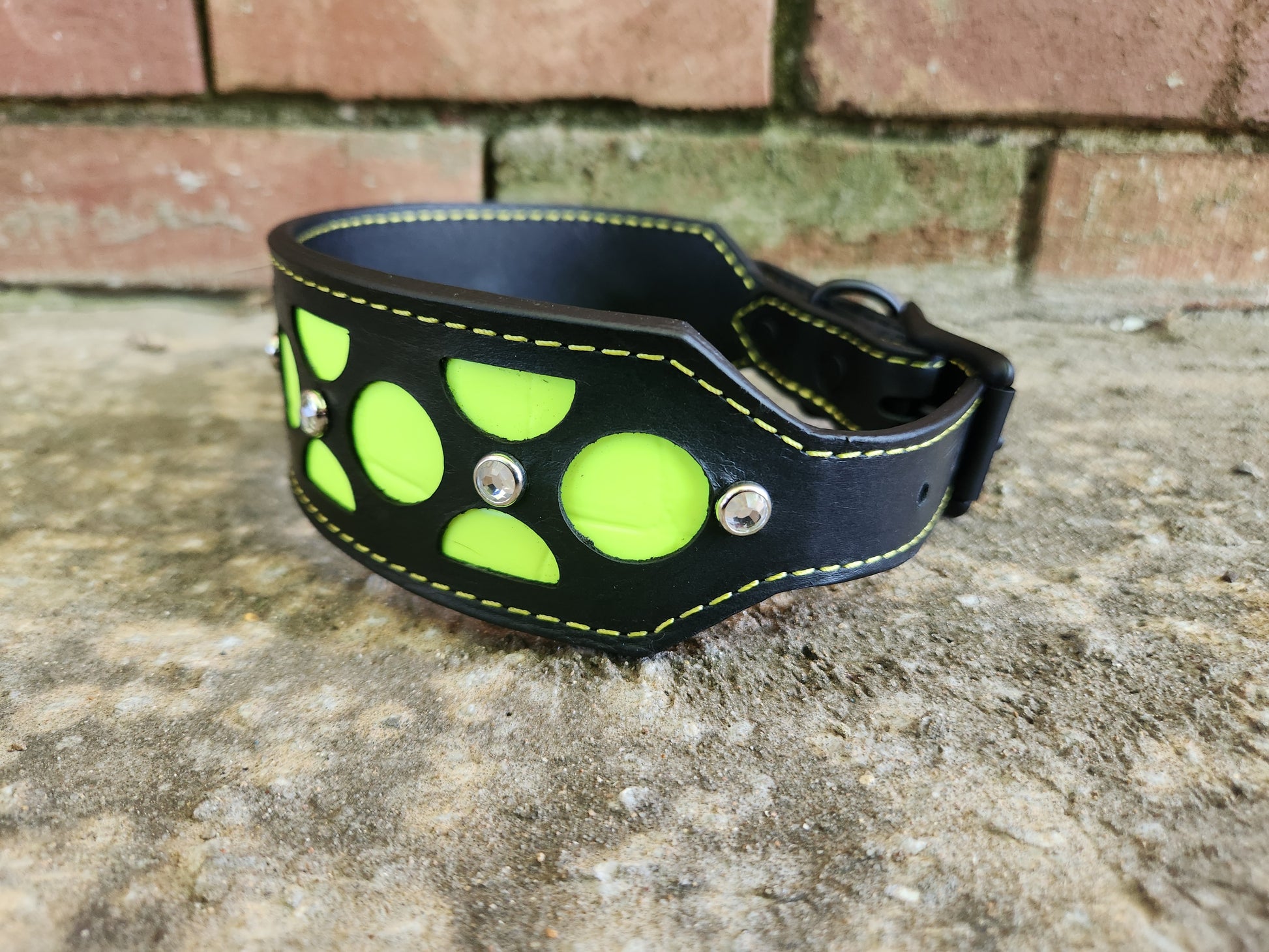 Bright, bold, and unapologetically fun — Neon Pop is a statement collar that channels retro arcade vibes with a modern edge. Vibrant neon green half-circle cutouts burst through matte black leather, creating a playful polka-dot illusion. Clean yellow stitching and sparkling rivets add extra punch, while the sleek black hardware keeps the look sharp and stylish. Collar is 2in wide and tapers down to 1in fitting a 15-19in neck.