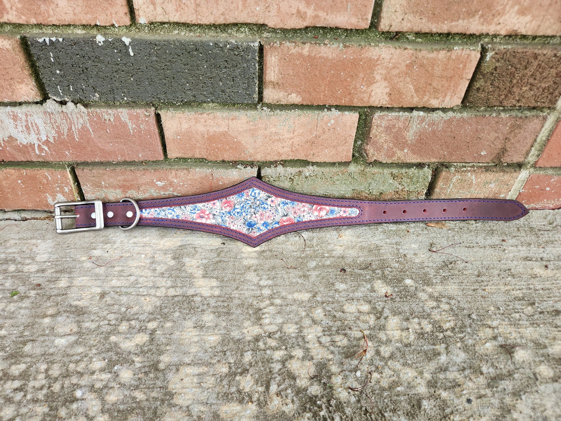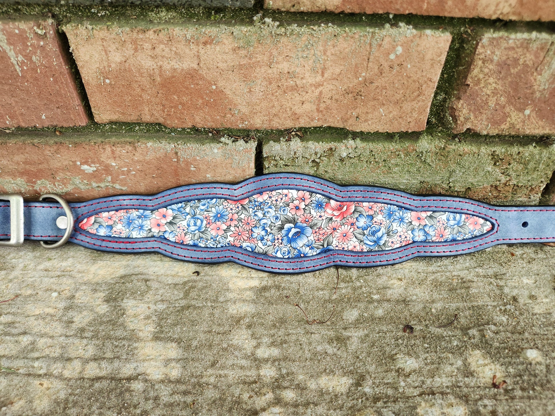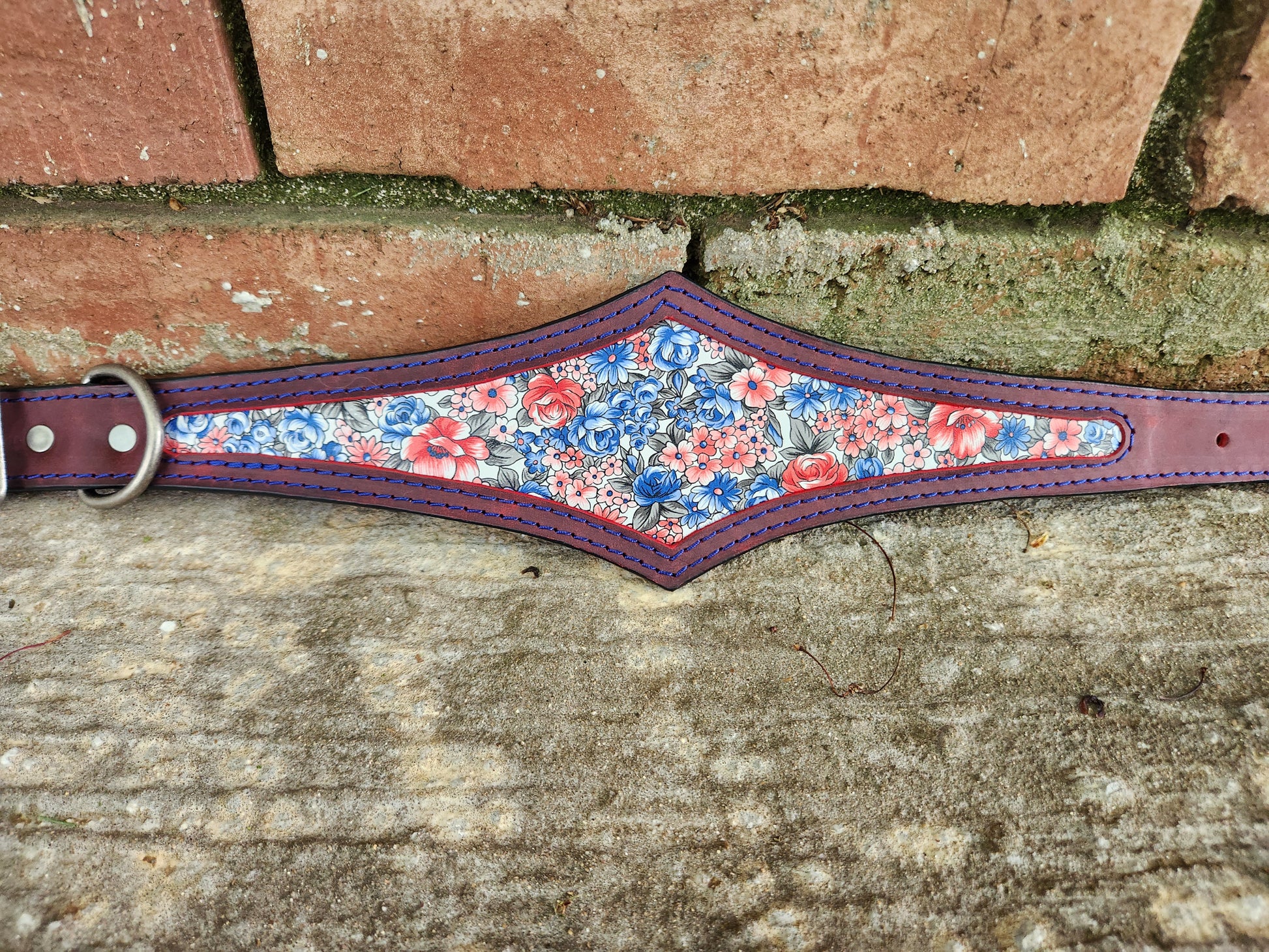 Celebrate your pet’s style with this gorgeous patriotic floral leather collar, handcrafted for both elegance and durability. Available in your choice of deep red or deep blue leather framing, this collar is inlaid with a charming floral pattern that adds a festive, Americana flair.