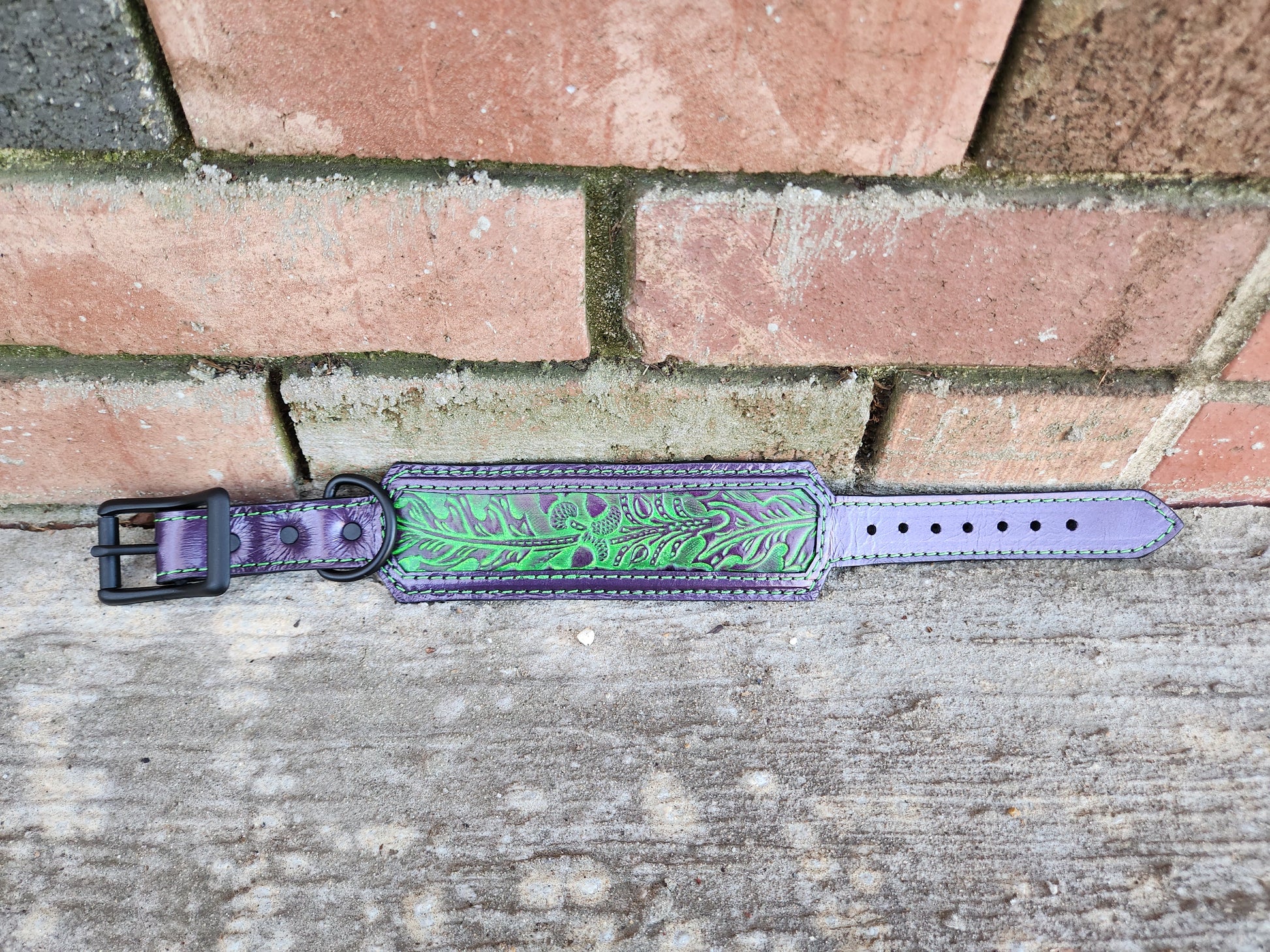Dark Purple & Bright Green Leather Collar – Embossed Leaves & Acorns Design with Black Hardware