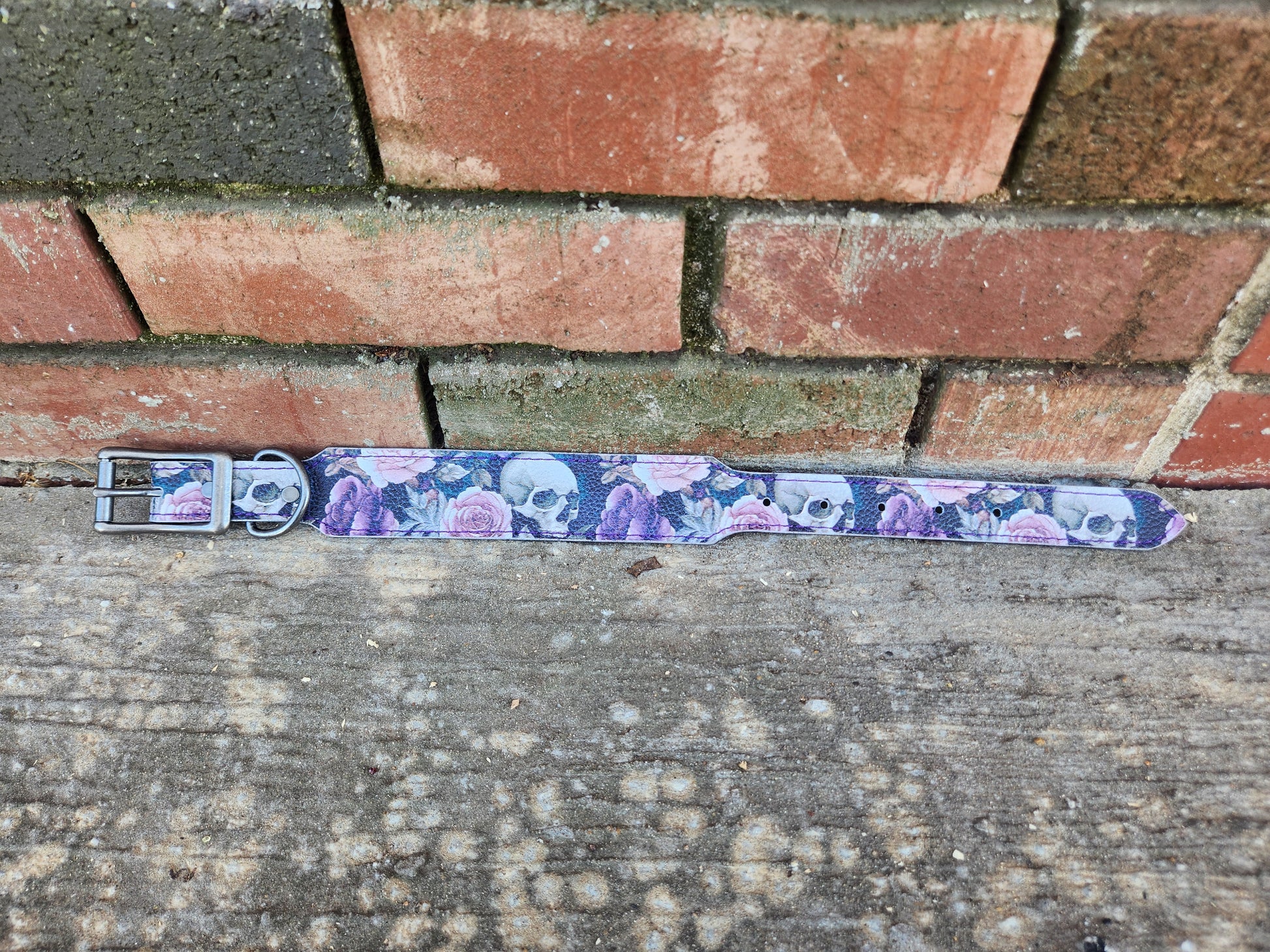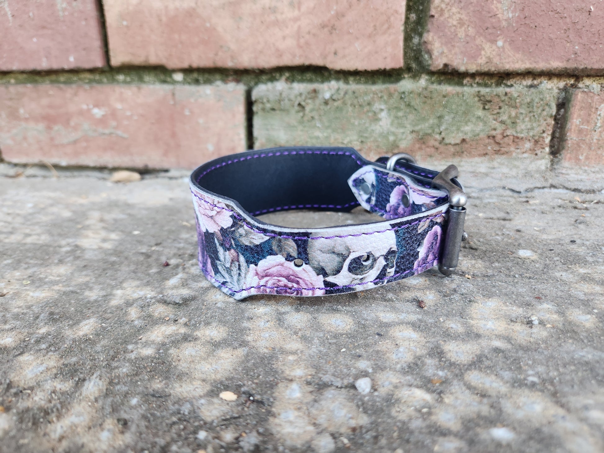 Rich purple stitching adds contrast and durability, while the standout leather showcases a striking pattern of pink and purple roses intertwined with skulls—perfect for dogs (and humans) who like a little attitude with their elegance.