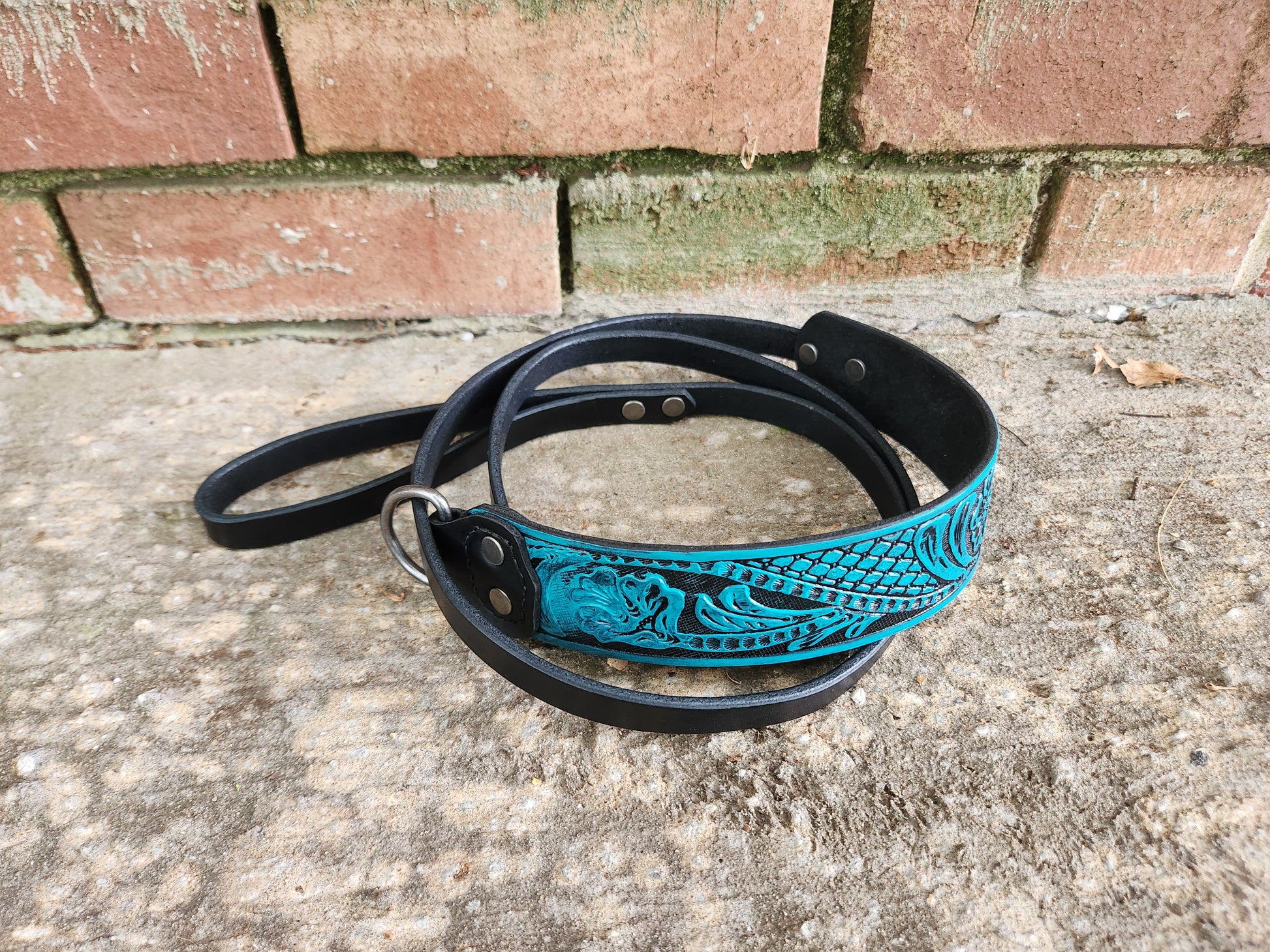 Leather slip leash featuring a black base with a striking black and teal western floral design. The collar portion is 1.5 inches wide and tightens down to 12 inches, while the leash measures 4 feet long and ½ inch wide.